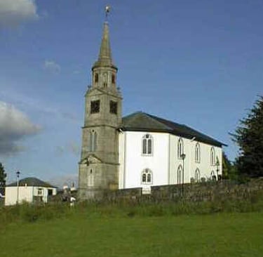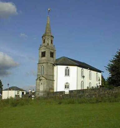 The present Church was designed by Robert McLachlane and completed in 1790, just as the new planned village of Eaglesham was taking shape. The Gothic-style structure, originally octagonal, is joined to a classical ashler steeple with clock tower, inscribed with the uncompromising